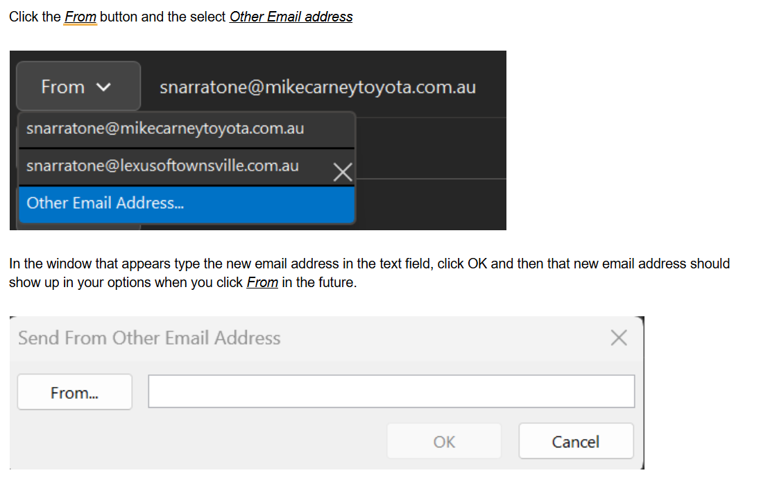 In the window that appears type the new email address in the text field, click OK and then that new email address should show up in your options when you click From in the future.