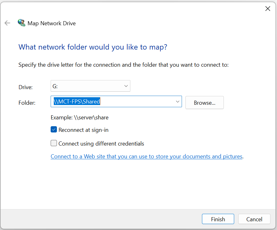4. Select the letter G then type in this command \\MCT-FPS\Shared / For the Common Drive select P: \\MCT-FPS\Common