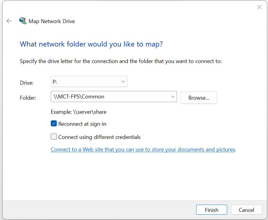 The same process is conducted for the P: Common Drive but with this command \\MCT-FPS\Common.
